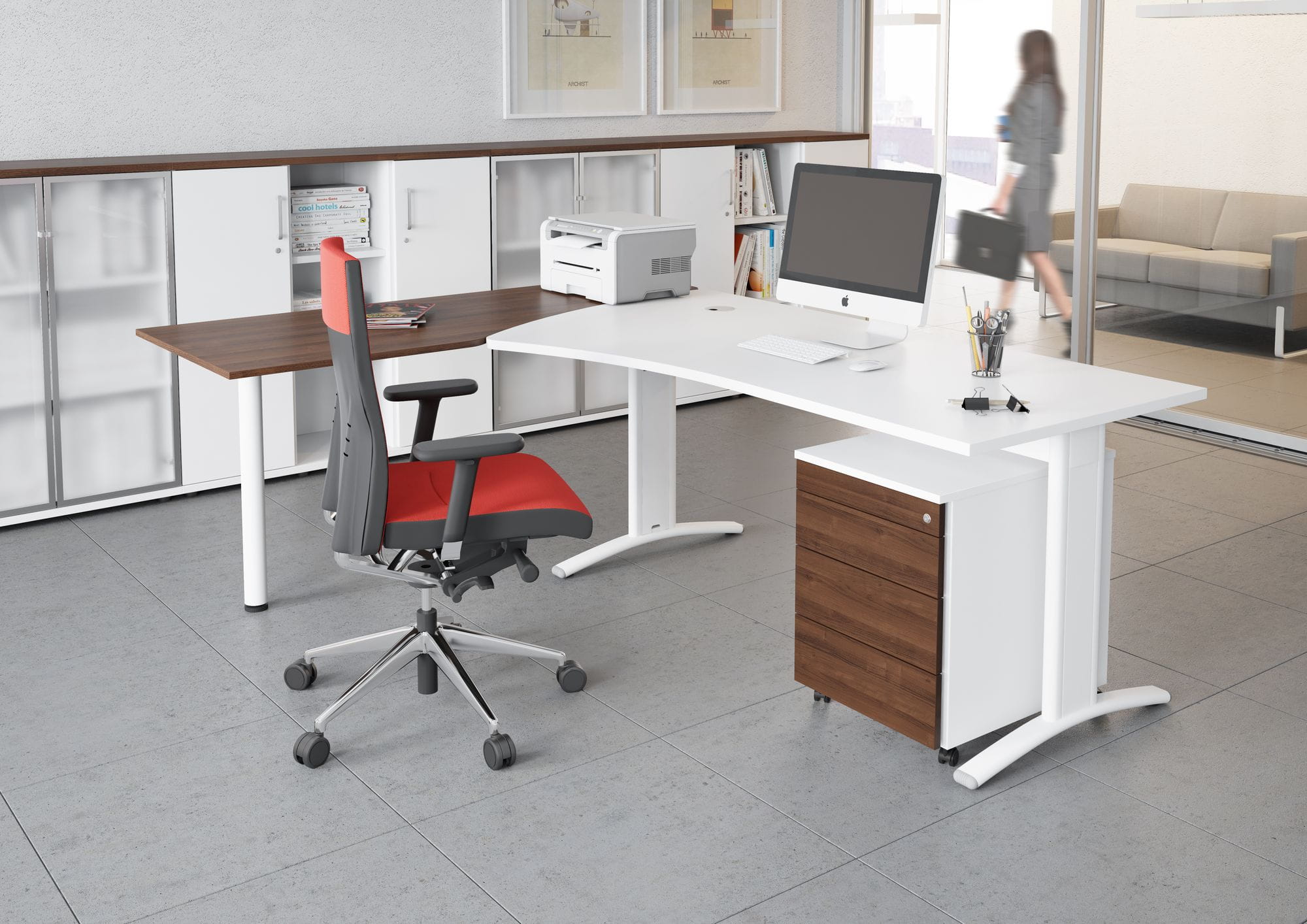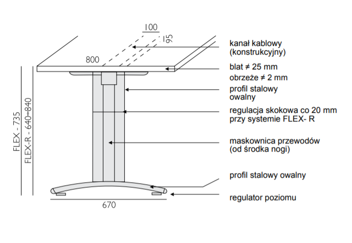 Efektowny model stelaża. W wersji Flex-R dający możliwość dostosowania wysokości blatu roboczego do indywidualnych potrzeb użytkownika (wersja ze skokową regulacją wysokości). Blaty wykonane z płyty melaminowanej. Klasa higieny E1 Blat – gr. 25mm, obrzeże – gr. 2mm Noga – metalowa malowana proszkowo Pod blatem – poziomy kanał kablowy W nogach – pionowy kanał kablowy Poziomowanie – do 15mm System Flex-R – regulacja wysokości biurka od 64 do 84cm – skokowa co 2cm