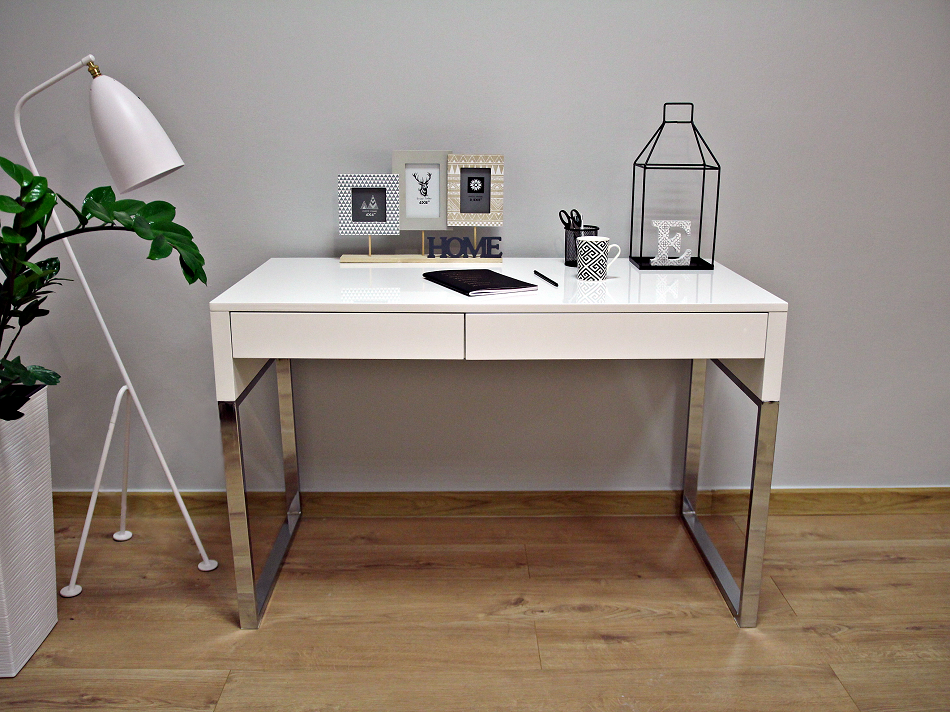 - Blat biurka wykonany z płyty MDF lakierowanej na wysoki połysk w kolorze białym