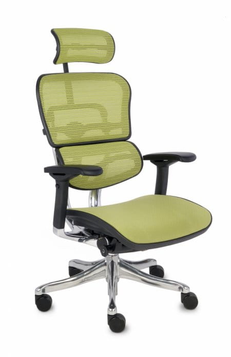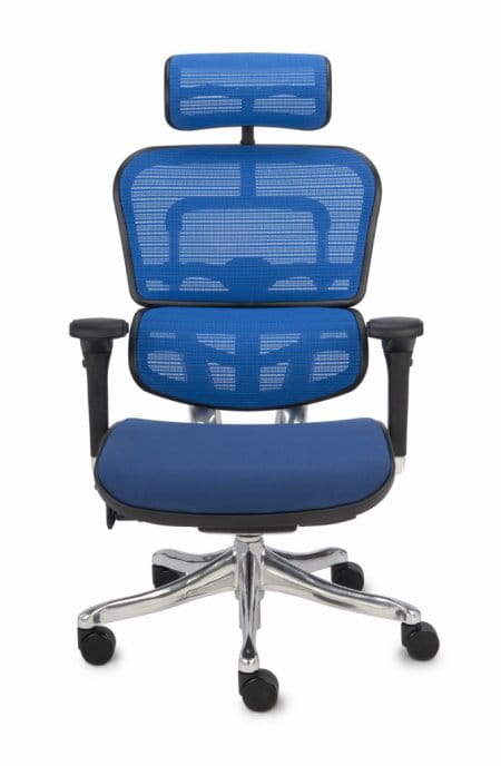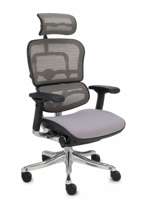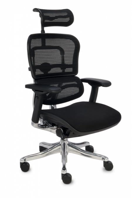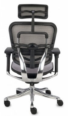 Cena dla modelu Ergohuman BT z mechanizmem Synchro z joystickiem, z regulowanym podłokietnikiem, oparciem i zagłówkiem, aluminiowa podstawa, czarny stelaż, siedzisko wykonane z tkaniny, a oparcie z siatki.