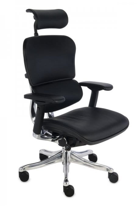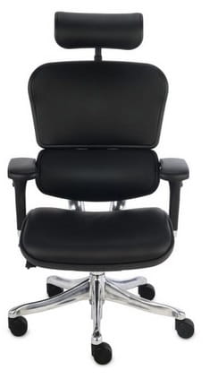 Cena dla modelu Ergohuman LE z mechanizmem Synchro z joystickiem, z regulowanym podłokietnikiem, oparciem i zagłówkiem, aluminiowa podstawa, czarny stelaż, siedzisko i oparcie tapicerowane skórą licową.