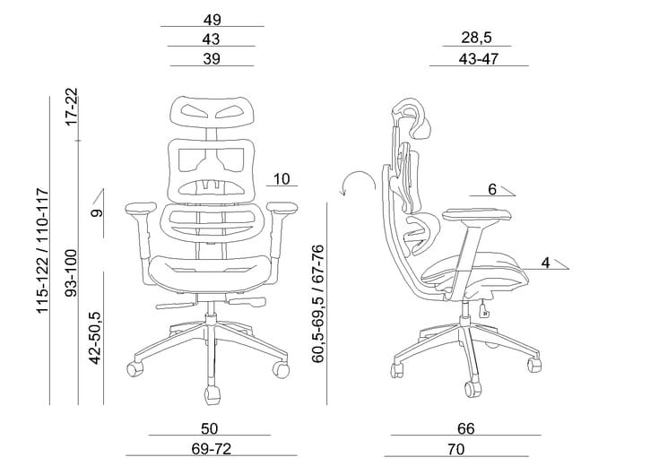 - Regulowane podłokietniki góra-dół, przód-tył, wychylenie na boki