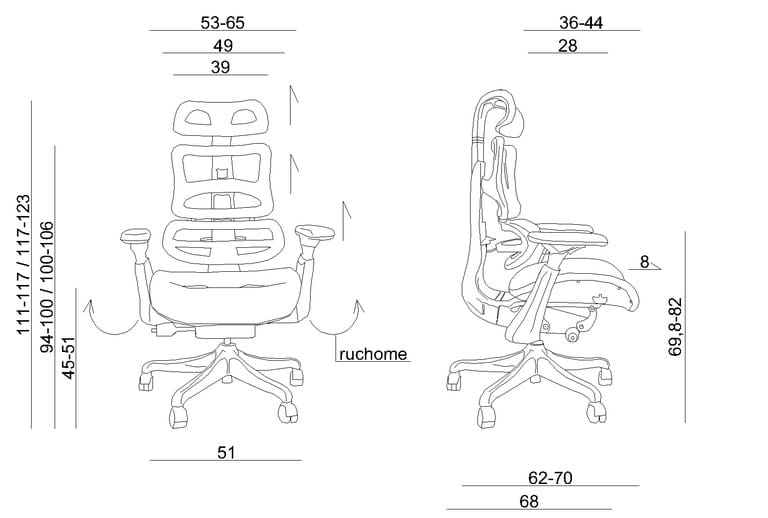 - Regulowane podłokietniki góra-dół, przód-tył, wychylenie na boki