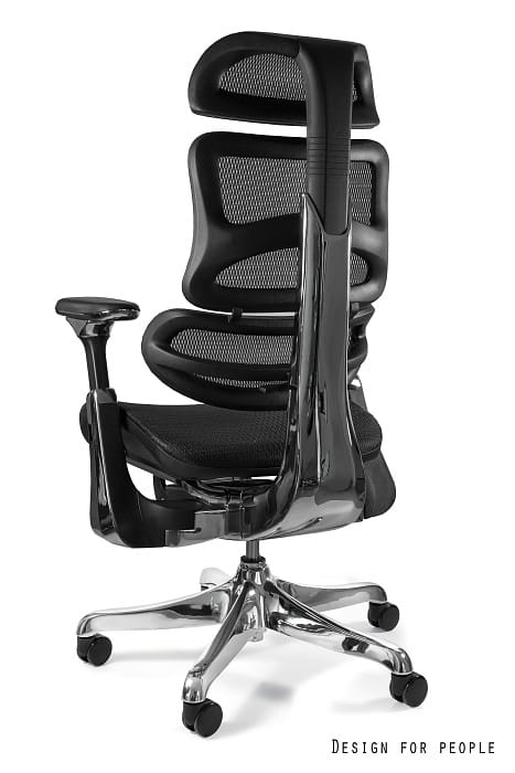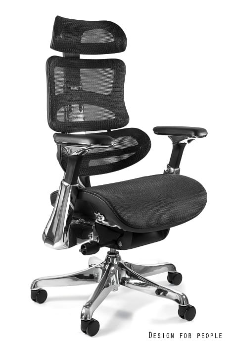 ERGOTHRONE to fotel najwyższej klasy, elegancki i funkcjonalny, gwarantujący komfort i wygodę każdemu użytkownikowi. Fotel ergonomiczny został wyposażony w odpowiednio wyprofilowane siedzisko, oparcie (z podparciem całego kręgosłupa, uwzględniającym jego naturalne krzywizny) i zagłówek tapicerowane siatką zapewniającą optymalną cyrkulację powietrza. Ponadto fotel posiada regulowane w dwóch płaszczyznach podłokietniki, system ważący SYNCHRON, a w wersji z podnóżkiem - również wygodne podparcie dla stóp. Uniwersalny, czarny kolor oraz elegancka, srebrna konstrukcja z polerowanego aluminium idealnie wpiszą się w każdą przestrzeń biurową, bez względu na jej styl czy kolorystykę.