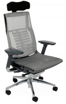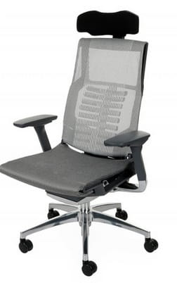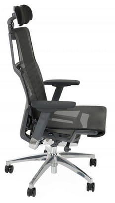Cena dla modelu Pofit BS z mechanizmem Synchro z joystickiem, z regulowanym podłokietnikiem, oparciem i zagłówkiem, aluminiowa podstawa, grafitowy stelaż, siedzisko i oparcie wykonane z siatki.