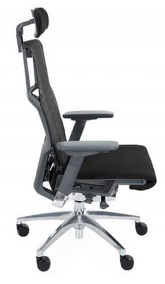 Cena dla modelu Pofit BT z mechanizmem Synchro z joystickiem, z regulowanym podłokietnikiem, oparciem i zagłówkiem, aluminiowa podstawa, grafitowy stelaż, siedzisko wykonane z tkaniny, a oparcie z siatki.