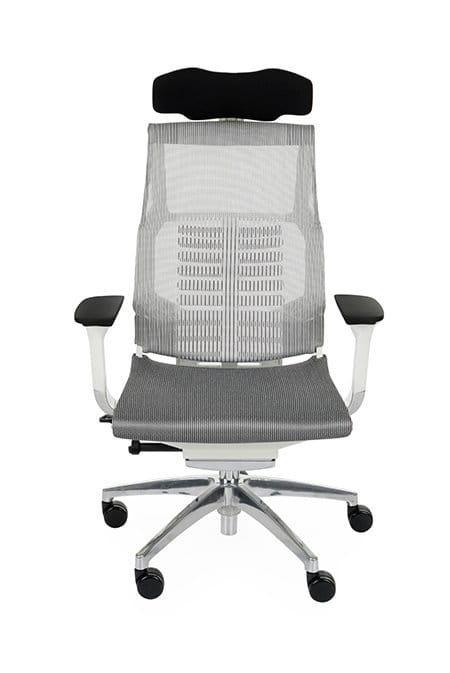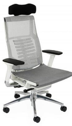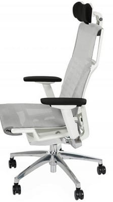 Cena dla modelu Pofit WS z mechanizmem Synchro z joystickiem, z regulowanym podłokietnikiem, oparciem i zagłówkiem, aluminiowa podstawa, biały stelaż, siedzisko i oparcie wykonane z siatki.