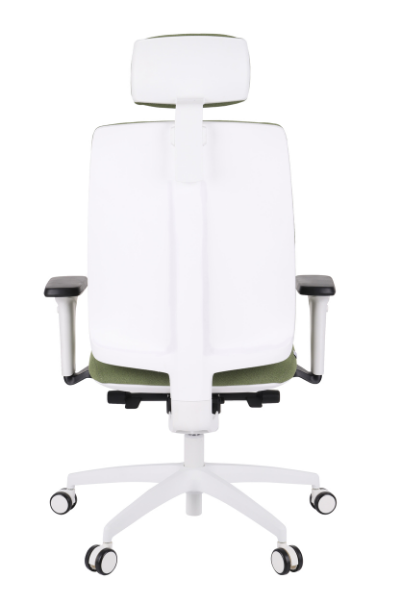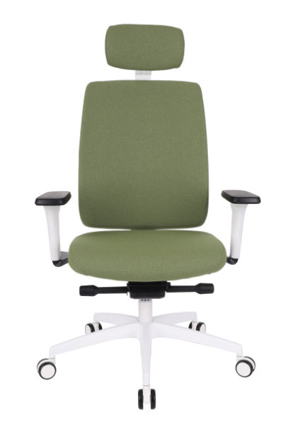 Ergonomiczny fotel biurowy z zagłówkiem, tapicerowanym oparciem, siedziskiem i białym stelażem. Do wyboru wiele rodzajów tkanin obiciowych – plecionych, dzianinowych i welwetowych, które dodatkowo mogą posiadać apretury funkcyjne – łatwoczyszczące, hydrofobowe lub redukujące wirusy, bakterie i grzyby z powierzchni fotela. Nylonowa podstawa jezdna dostępna jest w dwóch kolorach – białym i chromowanym z polerowanego aluminium.