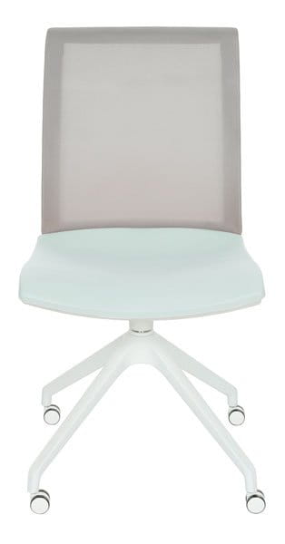 Cena obejmuje model Level Cross Roll WS na białym stelażu, siatkowe oparcie w kolorze szarym, tapicerowane siedzisko w materiale z podstawowej grupy tkanin, bez podłokietnika, biała nylonowa piramidalna obrotowa podstawa zakończona kółkami.