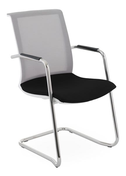 Cena obejmuje model Level V WS Arm Chrome na białym stelażu, siatkowe oparcie w kolorze szarym, tapicerowane siedzisko w materiale z podstawowej grupy tkanin, chromowana podstawa tzw. płozy ze zintegrowanym podłokietnikiem.