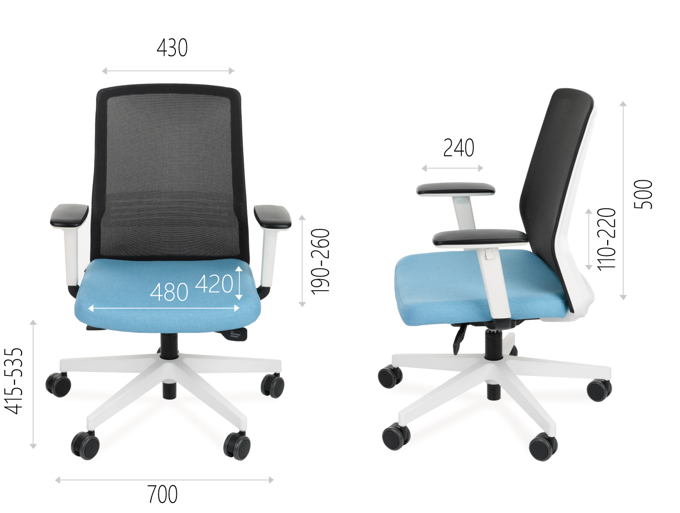 Lekka, biała podstawa jezdna, wyposażona jest w kółka o średnicy 60 mm. Już w wyposażeniu standardowym kółka są bezpieczne dla parkietów i paneli. Dobrze sprawdzą się także na dywanach.