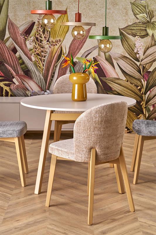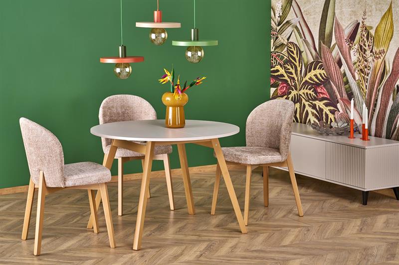 Stół Ruben to elegancka propozycja dla osób poszukujących mebla o prostym, ale jednocześnie nowoczesnym designie. Jego rozkładana konstrukcja sprawia, że jest bardzo funkcjonalny, idealny do przestronnych jadalni czy kuchni, gdzie potrzeba elastyczności przy organizacji przestrzeni. Blat stołu wykonany jest z płyty meblowej okleinowanej w kolorze kaszmir, co nadaje mu ciepły, przytulny charakter, a jednocześnie ułatwia utrzymanie go w czystości. Nogi stołu to drewno lite bukowe w naturalnym wybarwieniu, które wprowadza do wnętrza elementy natury i harmonii. Całość prezentuje się wyjątkowo elegancko, a dzięki zastosowanym materiałom stół jest trwały i odporny na codzienne użytkowanie.