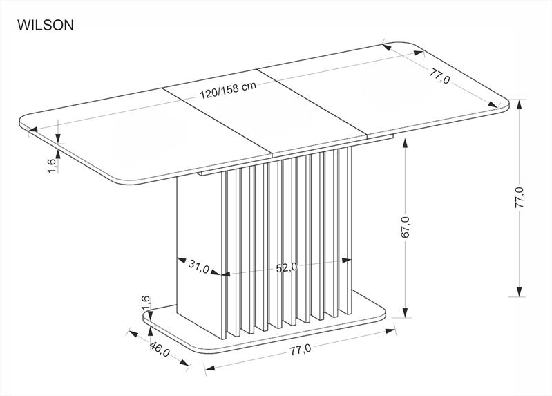 Stół Wilson to elegancki i nowoczesny mebel, który doskonale łączy funkcjonalność z estetyką. Jego charakterystyczną cechą jest nietypowa podstawa, która składa się z jednej nogi ozdobionej lamelami, co nadaje mu wyjątkowego, designerskiego wyglądu. Dzięki takiemu rozwiązaniu, stół zyskuje lekkość i nowoczesny charakter, a jednocześnie zapewnia stabilność.